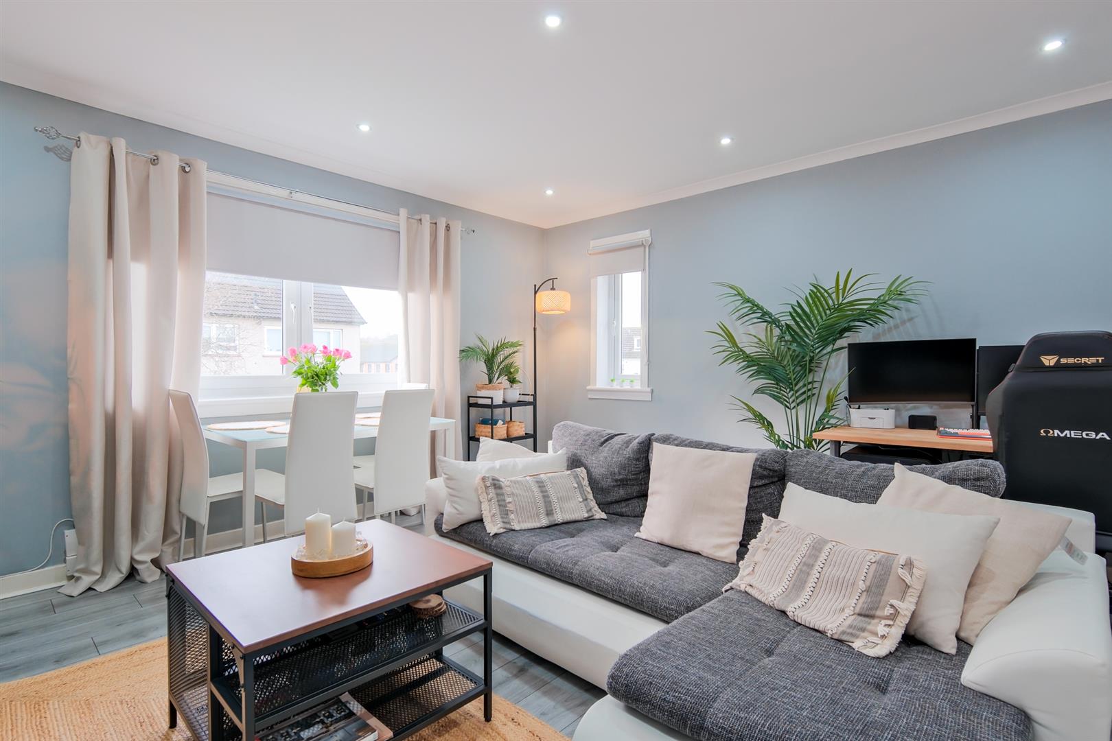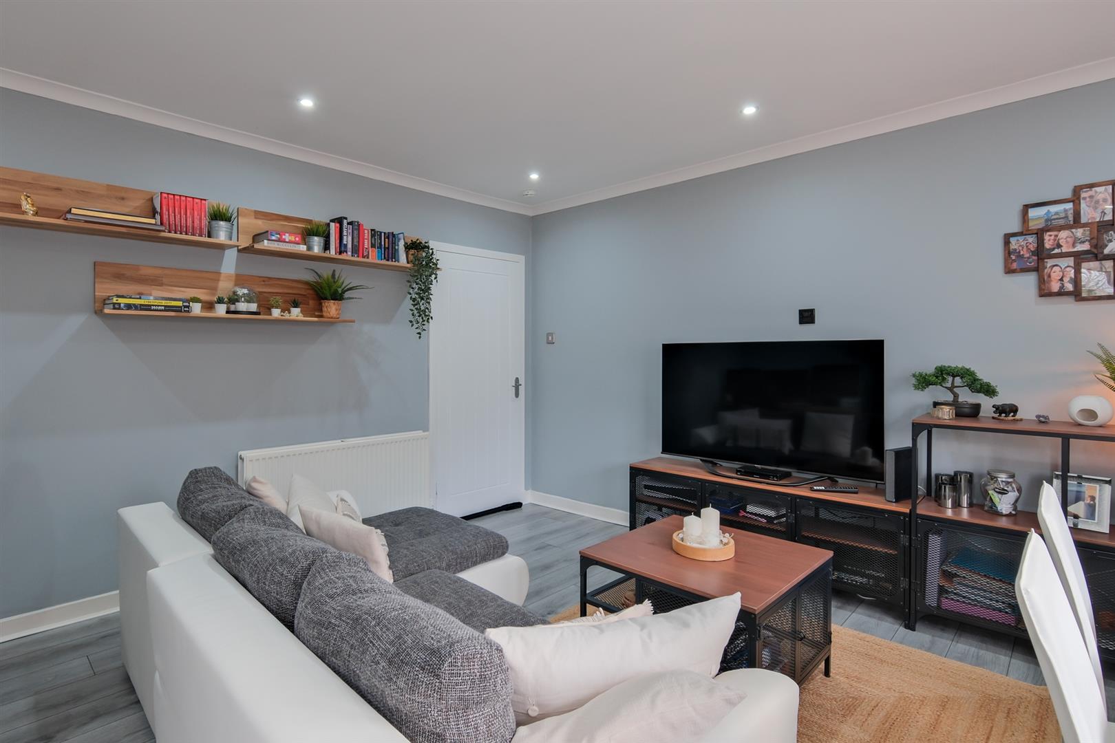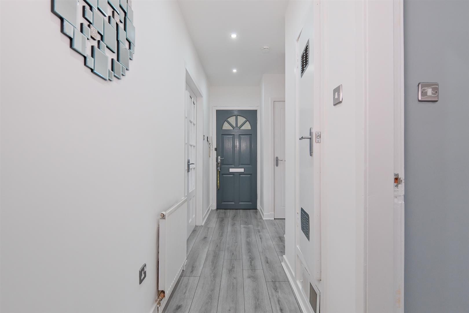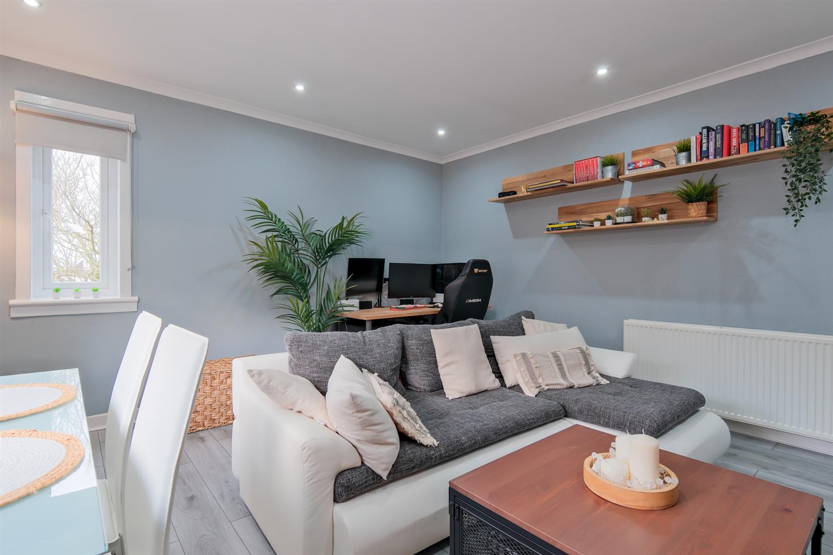 The accommodation comprising entrance hall offering a series of useful storage cupboards, large bright lounge with double aspects filling the space with an abundance of natural light, a great sized dining kitchen with integrated oven hob and cooker hood, two double bedrooms and immaculate bathroom.
